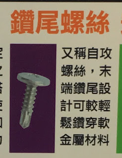 又稱自攻螺絲,末端鑽尾設計可較輕鬆鑽穿軟金屬材料